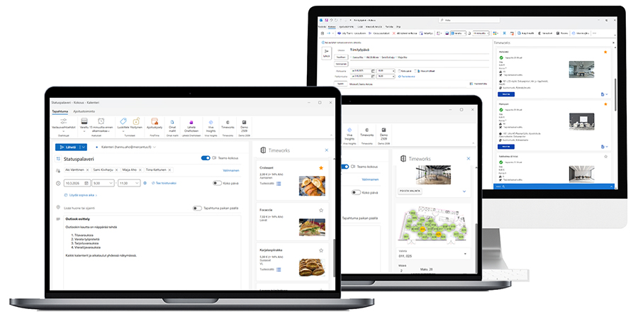 Timeworks Outlook Add in-toiminto on Outlookin lisäosa, joka soveltuu käyttäjille ja organisaatioille, jotka haluavat varata tiloja, työpisteitä sekä tilata tarjoiluja suoraan Outlookista.