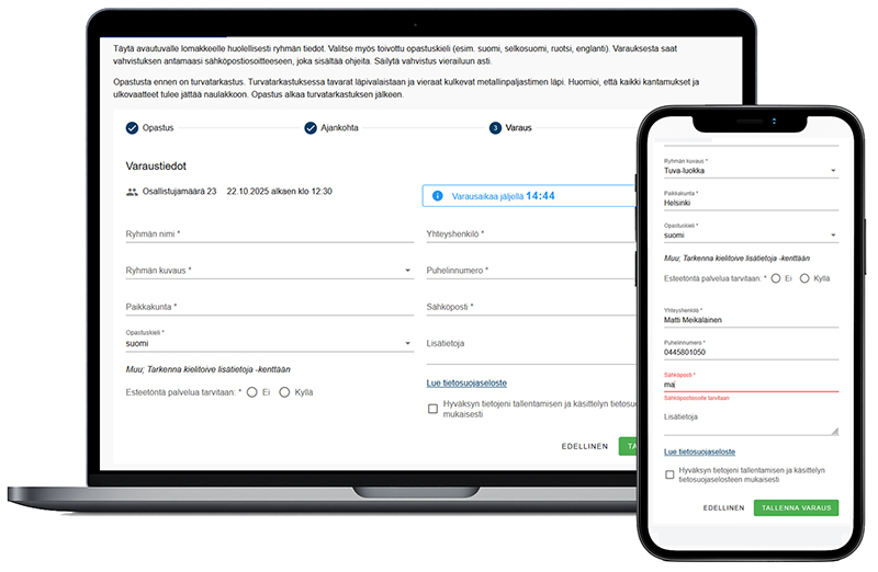 - Oppaille oma käyttöliittymä, johon oppaat voivat ilmoittaa saatavuutensa tai valita suoraan heille soveltuvan opastuksen.